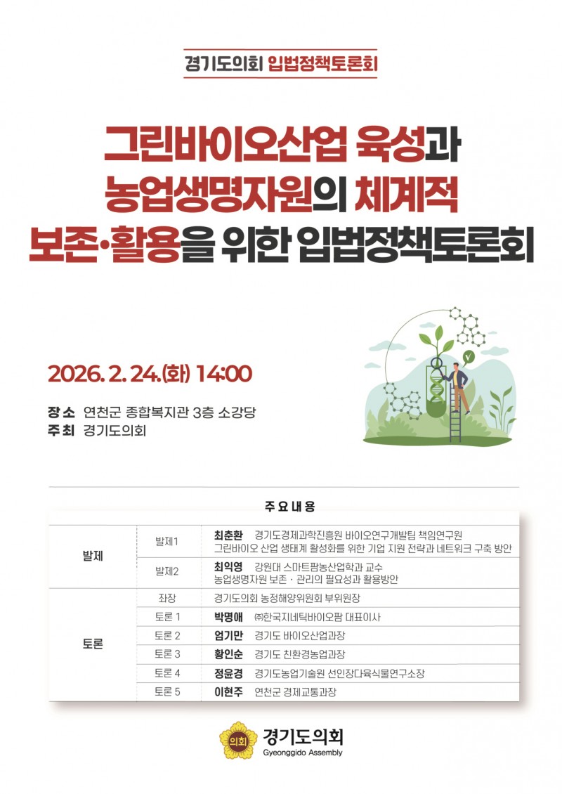 ▲경기도의회는 오는 2월 24일(화) 오후 2시 연천군 종합복지관 3층 소강당에서 「그린바이오산업 육성과 농업생명자원의 체계적 보존·활용을 위한 입법정책토론회」를 개최한다.이번 토론회는 경기도의회 농정해양위원회 윤종…