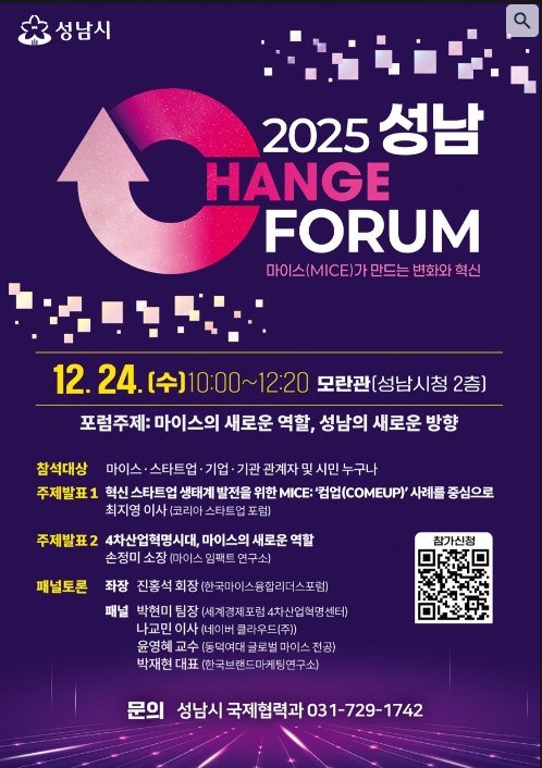 성남시(시장 신상진)는 오는 12월 24일 오전 10시 성남시청 모란관에서 ‘2025 성남 체인지 포럼(CHANGE Forum)’을 개최한다.