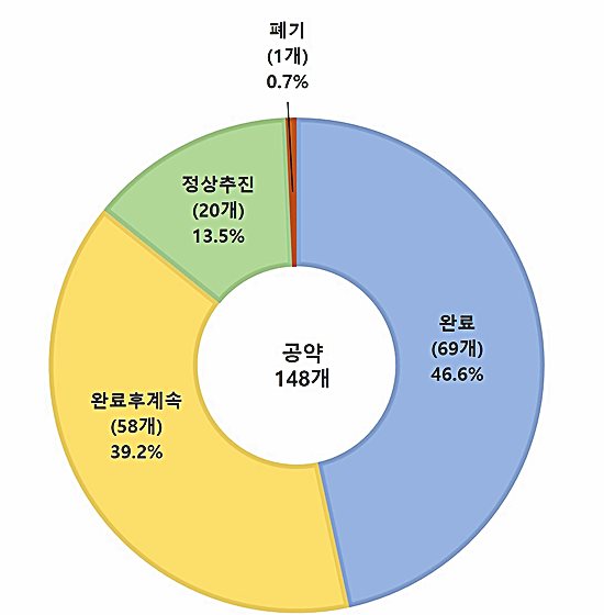공약 완료율은 85.8%(127개)다. 공약 이행률 96.1%는 완료사업(69개·이행률 100%)과 완료 후 계속 추진(58개·이행률 100%), 정상 추진(20개) 중인 사업별 추진 정도를 백분율로 환산한 평균값이다.