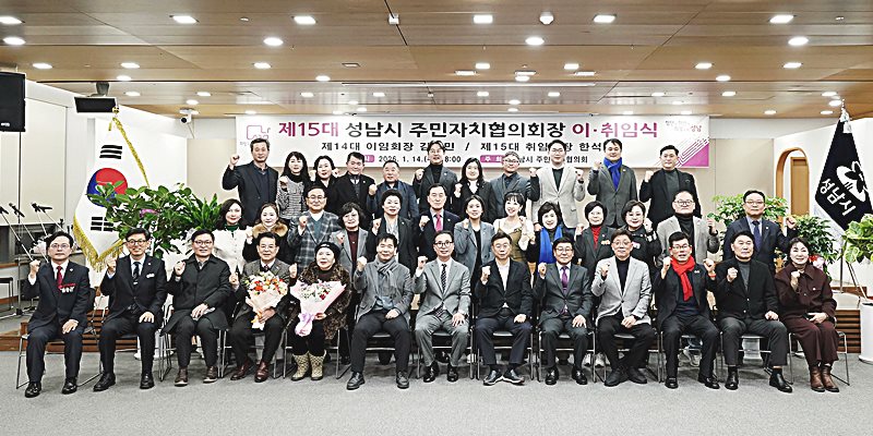 성남시 주민자치협의회는 1월 14일 오후 6시 시청 한누리에서 50개 동 주민자치위원장 등 150여 명이 참여한 가운데 주민자치협의회장 이·취임식과 출범식을 했다.