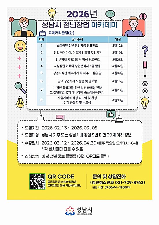 성남시(시장 신상진)는 오는 3월 5일까지 ‘청년창업 아카데미’ 무료 교육생 30명을 모집한다.