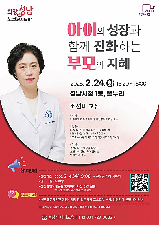 성남시(시장 신상진)는 올해 첫 ‘희망성남 토크콘서트’ 강연자로 부모 교육 전문가로 평가받는 조선미 아주대학교 의과대학 정신건강의학 교실 교수를 초빙한다.