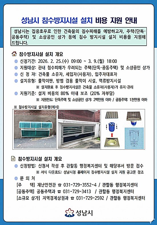 성남시, 집중호우 대비 ‘침수방지시설 설치 비용’ 최대 80% 지원