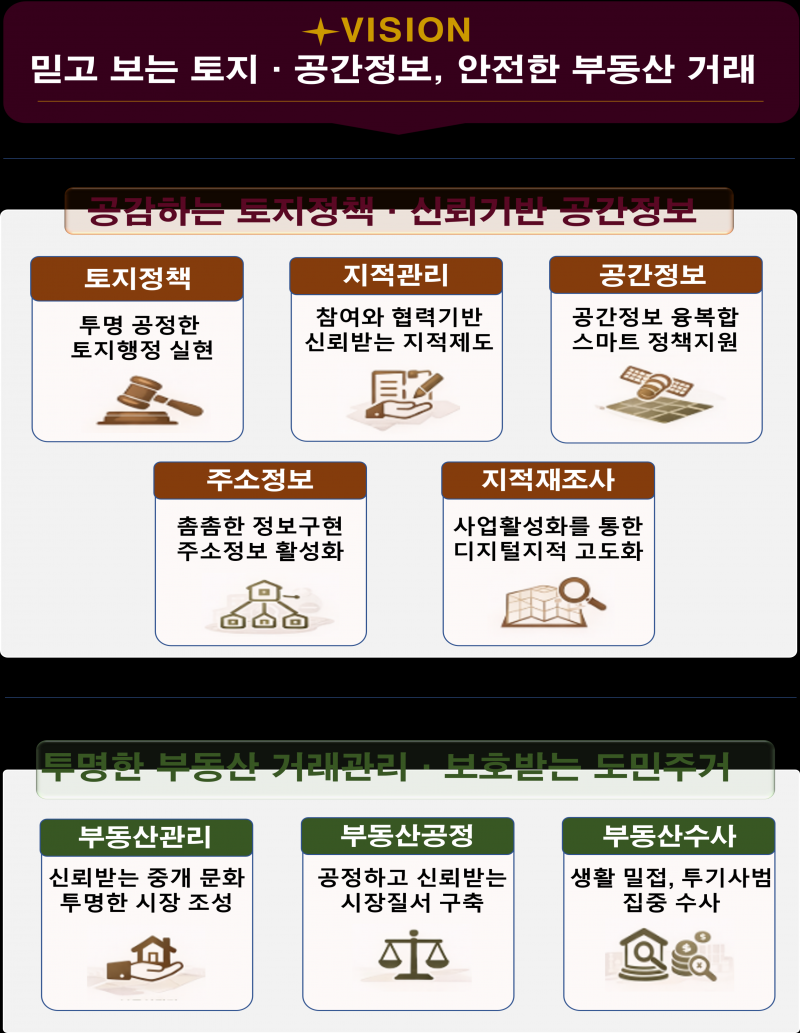 추진계획은 투명하고 균형 잡힌 제도 운영으로 신뢰받는 토지행정 실현 참여와 협력을 통한 신뢰받는 지적제도 정착 공간정보 융·복합을 통한 스마트한 정책 지원 촘촘한 주소정보 구현 및 주소정보 활성화 추진 사업활성화를 통한 디지털지적 고도화 신뢰받는 중개 문화와 투명한 부동산 시장 조성 공정하고 신뢰받는 시장질서 구축 생활밀접, 투기사범 집중수사 등 8대 전략을 바탕으로 한 92개 세부 이행과제로 구성됐다.