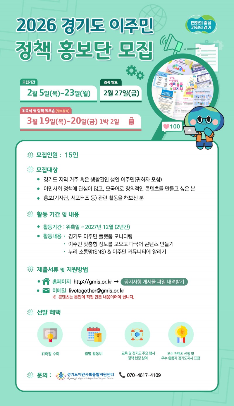 경기도이민사회통합지원센터에서 오는 23일까지 ‘2026 경기도 이주민 정책 홍보단’ 15명을 모집한다.