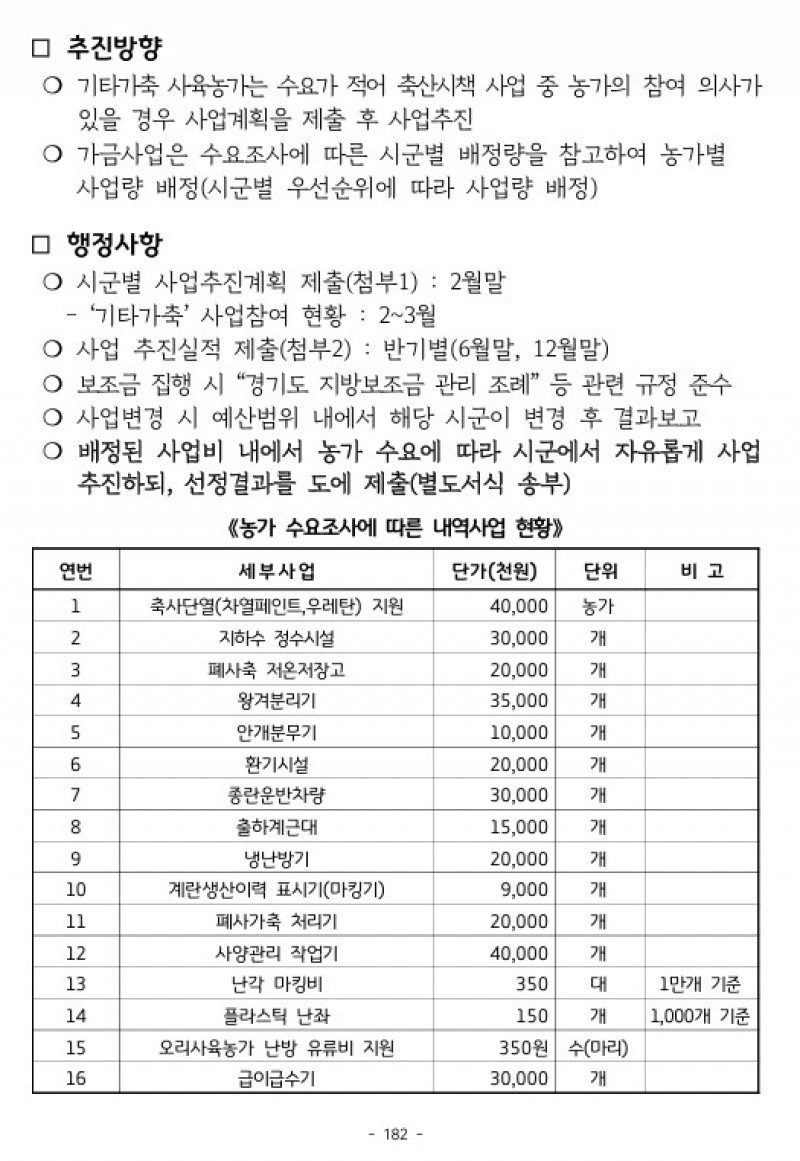 ‘가금 및 기타가축 사육농가 지원사업’은 시설 현대화를 통한 축사 환경 개선, 방역 물품 지원 등을 통한 생산성 향상이 주요 내용이다.