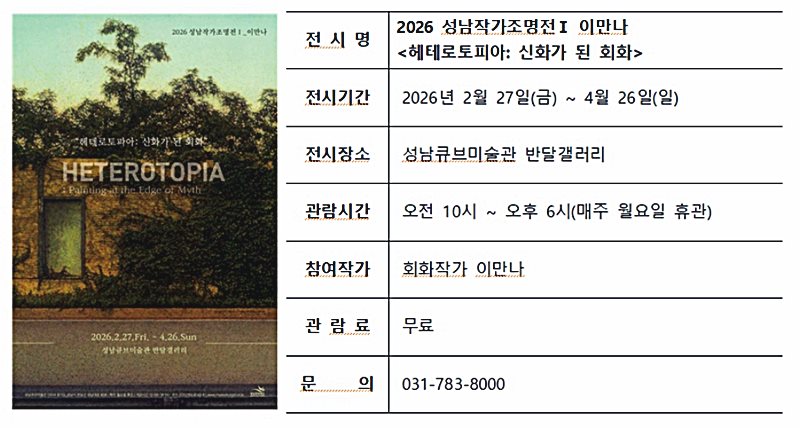 성남문화재단(대표이사 윤정국)은 지역의 역량 있는 작가들의 작품 세계를 집중 조명하는 기획전 2026 성남작가조명전의 첫 번째 전시로 ‘헤테로토피아: 신화가 된 회화’를 오는 2월 27일(금)부터 4월 26일(일)까지 성남큐브미술관 반달갤러리에서 개최한다.