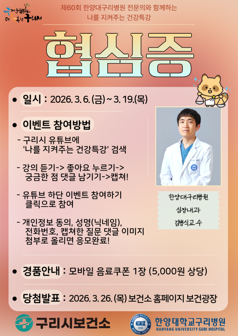 특강은‘구리비전’ 채널을 통해 시청할 수 있다. 시청 후 6일부터 19일까지 궁금한 사항을 댓글로 남기면 우수질문 3건을 선정해 한양대구리병원 심장내과 김병식 교수가 직접 답변할 예정이다. 또한 참여자 중 17명을 무작위로 선정해 우수 질문자 3명을 포함한 총 20명에게 모바일 쿠폰을 증정한다.
