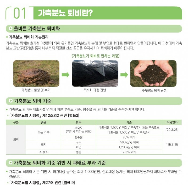 관내 축산농가 중 허가대상은 연 2회, 신고대상은 연 1회 검사 의무화 「가축분뇨의 관리 및 이용에 관한 법률」에 따라 가축분뇨 배출시설 설치 및 운영자, 퇴·액비를 처리·살포하는 자는 반드시 부숙도 검사를 실시해야 한다. 특히, 퇴·액비를 외부로 반출할 때는 반드시 부숙도 검사를 완료하고 "부숙완료" 판정을 받은 퇴비만을 반출해야 법적 불이익을 피할 수 있으며, 검사를 희망하는 농가는 퇴비 더미 중 5~10군데에서 2㎏ 이상 채취해 균일하게 혼합 후 500g 가량을 정해진 시료 봉투에 담아 여주시 농업기술센터 내 종합검정실 2층에 방문·의뢰하면 무료로 검사결과를 받을 수 있다.