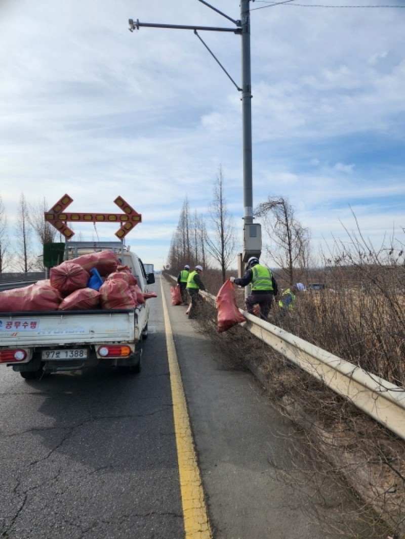 시는 지난 2월 26일 시작하여 3월 15일까지 관내 주요 국도 구간을 대상으로 환경 정비를 실시 중이며, 현재 교차로 및 비탈면 등에서 생활 쓰레기와 불법 투기 폐기물 등 1톤 마대 80여 개 분량의 폐기물을 수거하는 등 국도변 청소 작업을 하고 있다.