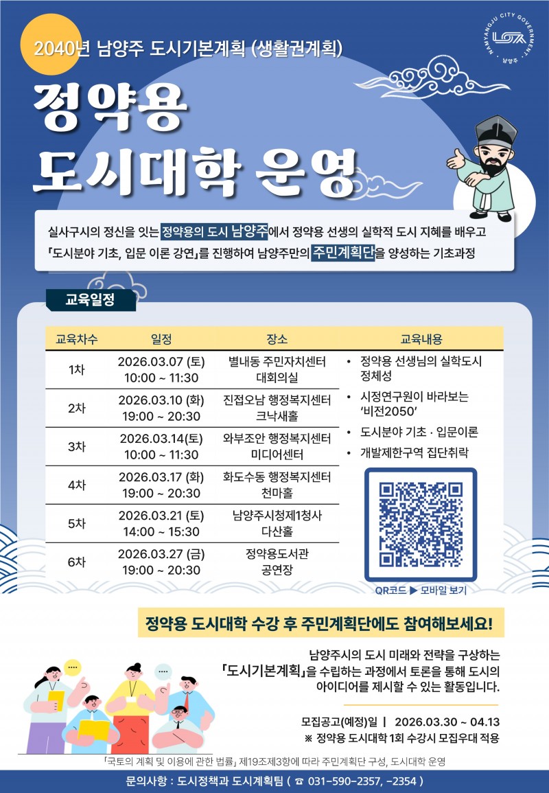 강연은 시민 참여 기회 확대를 위해 권역별로 나눠 총 6회에 운영한다. 일정은 △1차 7일 별내동 주민자치센터 △2차 10일 진접오남행정복지센터 △3차 14일 와부조안행정복지센터 △4차 17일 화도수동행정복지센터 △5차 21일 시청 다산홀 △6차 27일 정약용도서관 순이다.