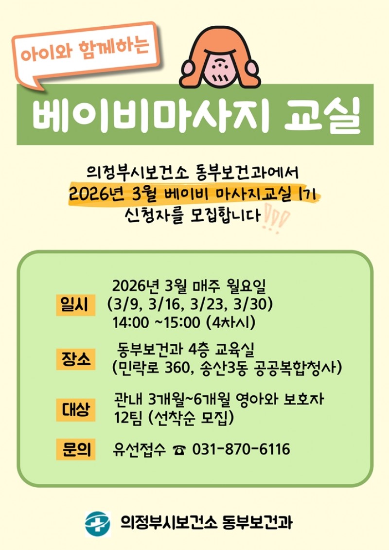 ‘베이비 마사지교실’은 상반기와 하반기 각 1기씩 총 2기로 운영한다. 접수 및 기타 문의 사항은 의정부시 보건소 동부보건과(031-870-6116)에서 안내받을 수 있다.