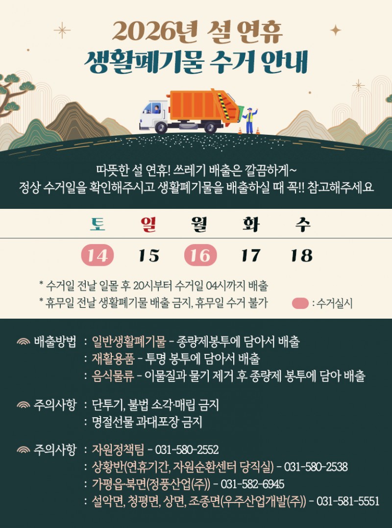 또한 군은 연휴 기간 상황반(031-580-2538)을 별도 운영해 생활폐기물 배출 및 수거와 관련한 민원을 신속히 처리하고 군민 불편을 최소화한다는 방침이다.