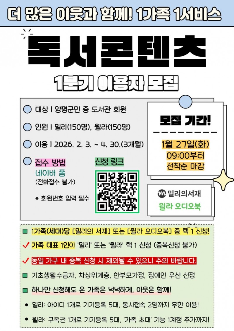 이번 1분기 모집 규모는 밀리의 서재 150가구, 윌라 150가구 등 총 300가구이며, 양평군민 중 도서관 독서 회원이라면 누구나 신청할 수 있다. 접수는 오는 27일 오전 9시부터 인터넷 신청서(네이버 폼)를 통해 선착순으로 진행된다.