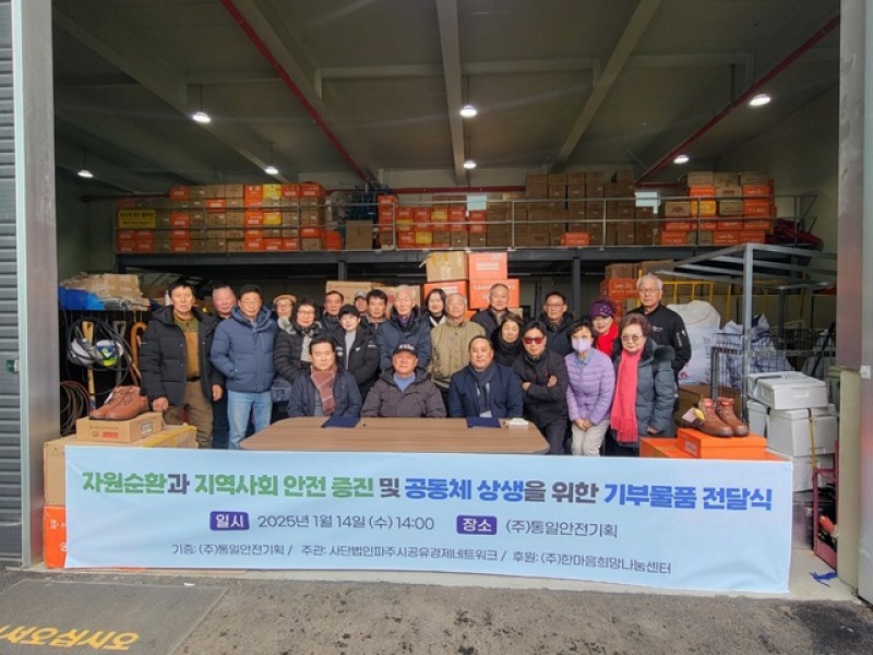 파주시는 지난 14일, 사회적기업 ㈜통일안전기획(대표 이재민)이 기부한 안전화 3,000켤레를 ㈔파주시공유경제네트워크가 지역 수요에 맞춰 배분하는 전달식을 진행했다고 밝혔다.