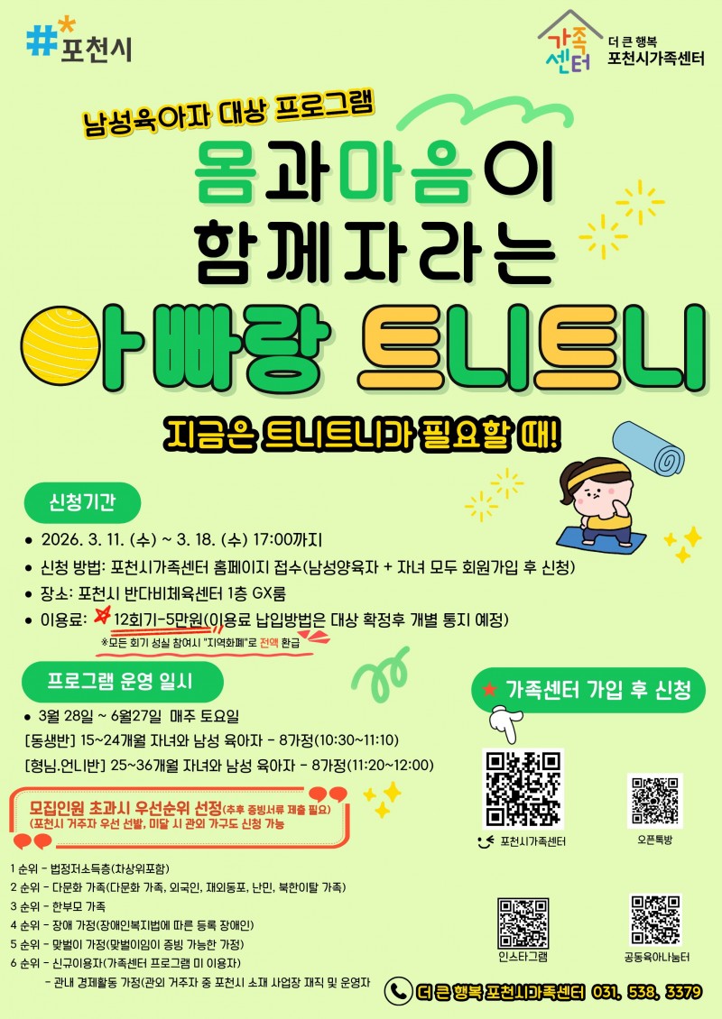 참여 신청은 3월 11일부터 3월 18일까지 포천시가족센터 누리집에서 가능하며, 남성 양육자와 자녀 모두 회원가입을 완료한 뒤 각각 신청해야 한다.
