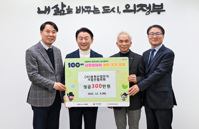 의정부시(시장 김동근)는 12월 9일 ㈔용현산업단지 기업인협의회(회장 김정인)가 ‘100일간 사랑릴레이 배턴 잇기’에 동참해 지역 내 취약계층 지원을 위한 성금 300만 원을 기탁했다고 밝혔다.