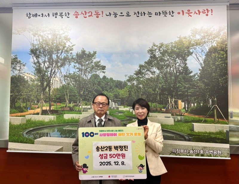 의정부시 송산2동주민센터(동장 황보경)는 12월 8일 지역 주민 박정진 씨가 취약계층 지원을 위해 성금 50만 원을 기탁하며 ‘100일간 사랑릴레이 배턴 잇기’에 동참했다고 밝혔다.
