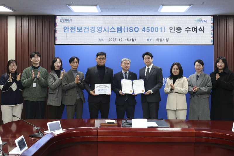 이날 시청 상황실에서 열린 인증 수여식에서는 경영 대리인인 정구원 화성특례시 제1부시장을 비롯해, 안상현 ISO 45001 선임 심사원 등이 참석한 가운데 인증서 및 현판 수여가 진행됐다.