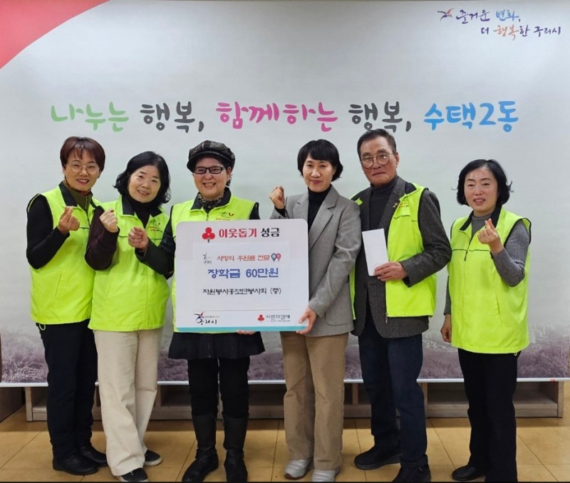 구리시(시장 백경현) 수택2동 행정복지센터(동장 박정희)는 지난 18일 구리자원봉사홍보단봉사회(회장 조점순)로부터 저소득 청소년들의 안정적인 학업 지원을 위한 장학금 60만 원을 전달받았다고 밝혔다.