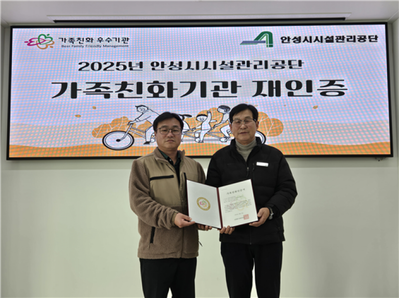 안성시시설관리공단(이사장 이정찬)은 지난 12월 성평등가족부로부터 가족친화기관 인증을 획득하고, 인증서를 부여받았다고 밝혔다. 이번 인증은 2017년 최초 인증 이후 세 번째 재인증으로, 공단의 가족친화경영 성과를 다시 한번 대외적으로 인정받은 것이다.