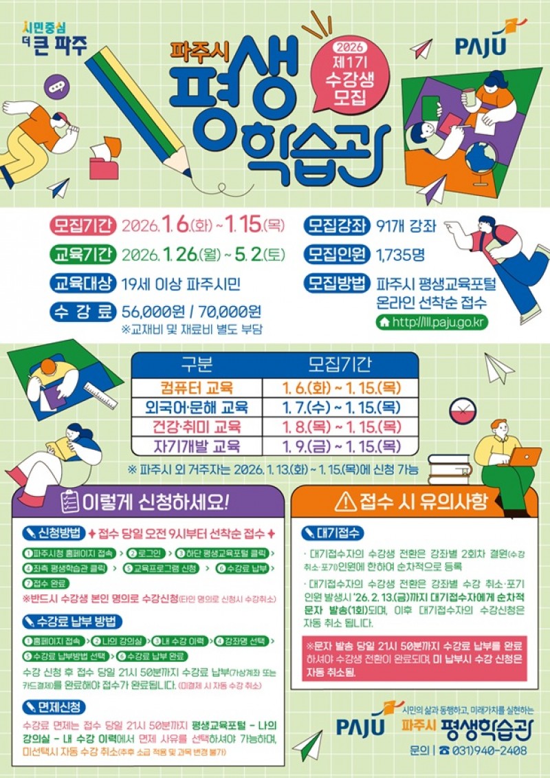 수강 신청은 파주시 평생교육포털 누리집을 통한 온라인 선착순 방식으로 진행되며, 디지털 이용이 어려운 시민은 파주시 평생학습관에서 신청 안내를 받을 수 있다.