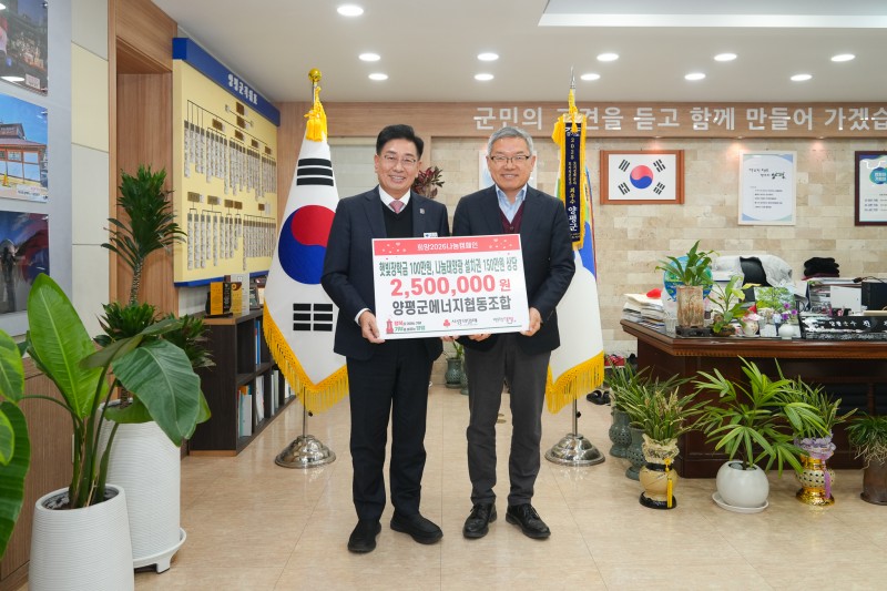 양평군(군수 전진선)은 지난 5일, 양평군에너지협동조합(이사장 최충기)이 햇빛장학금 100만 원과 150만 원 상당의 나눔태양광 설치권을 기탁했다고 밝혔다.