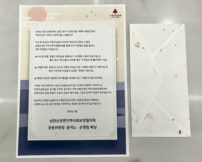 광주시 남한산성면 지역사회보장협의체는 2026년 병오년(丙午年) 새해를 맞아 지난 한 해 동안 지역 내 어려운 이웃을 위해 나눔을 실천해 온 후원자들에게 감사의 마음을 담은 서한문을 발송했다고 21일 밝혔다.