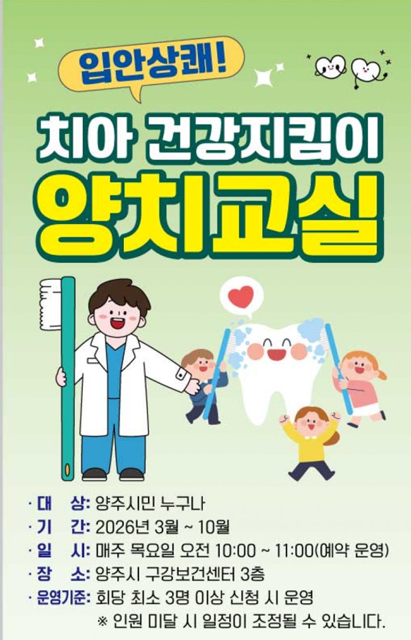 양주시보건소가 시민들의 올바른 양치습관 형성과 구강건강 증진을 위해 2026년 3월부터 10월까지 ‘입안 상쾌! 치아 건강지킴이 양치교실’을 운영한다.