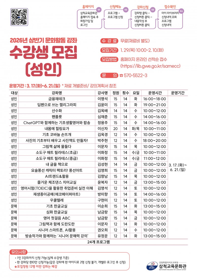 삼척교육문화관(관장 장병진)은 3월 17일부터 6월 21일까지 운영되는 ‘2026년 상반기 문화활동강좌’를 수강생을 모집한다.