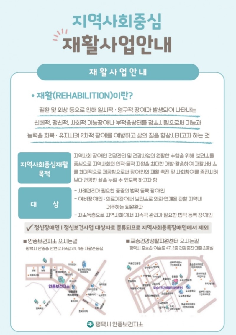 평택시 안중보건지소는 법적 등록 장애인과 예비장애인(손상이나 질병 발생 후 완전한 회복이 어려워 일정 기간 내 장애인이 될 것으로 예상되는 자) 및 지역 주민을 대상으로 체계적이고 전문적인 재활서비스 제공을 위해 재활운동실 운영과 지역사회 중심 재활사업을 추진하고 있다.