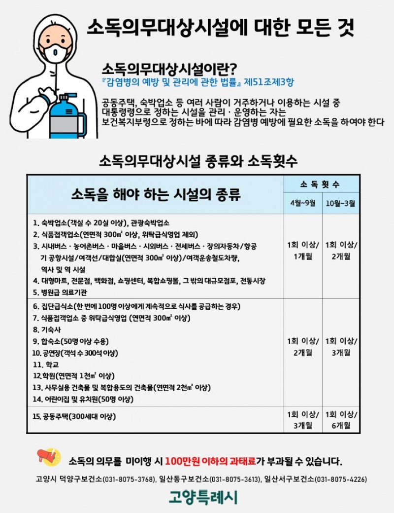 이에 고양시 3개 보건소는 소독의무대상시설에 소독기준과 횟수를 안내하고 소독실시 여부를 정기적으로 점검할 계획이다.