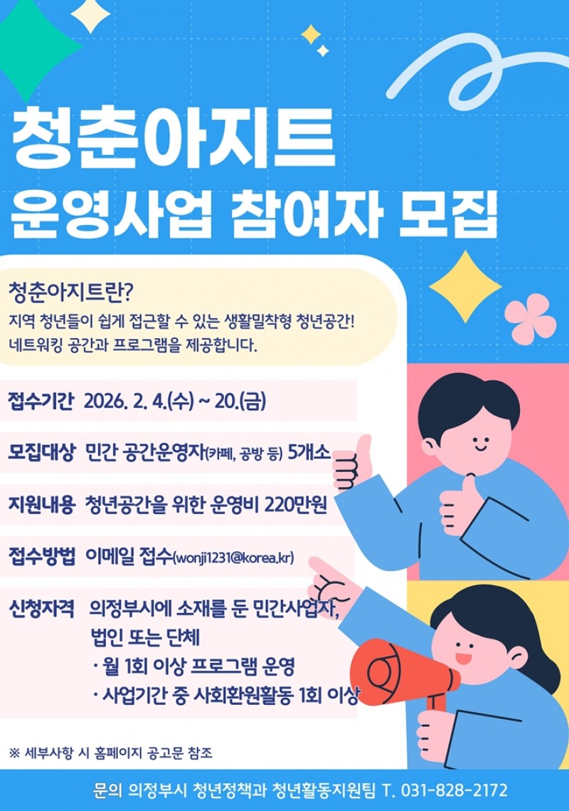 의정부시는 청년들이 일상 속에서 자유롭게 모이고 활동할 수 있도록 생활밀착형 청년공간 ‘청춘아지트’ 사업에 참여할 민간사업자를 모집한다.
