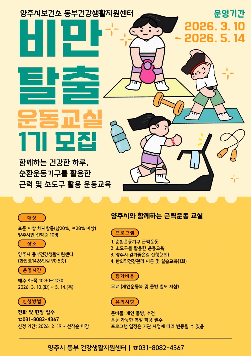 양주시보건소 동부 건강생활지원센터에서 지역 주민의 만성질환 예방과 건강한 생활 습관 형성을 위해 순환운동기구를 활용한 근력운동 프로그램인 2026년도 ‘비만탈출 운동교실’ 1기 참여자를 모집한다.