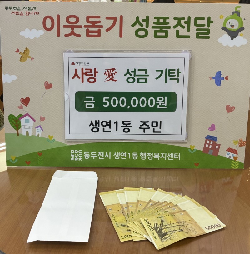 동두천시 생연1동 행정복지센터는 지난 20일 한 익명의 후원자가 어려운 이웃을 위해 써 달라며 현금 50만 원이 담긴 봉투를 전달했다고 밝혔다.