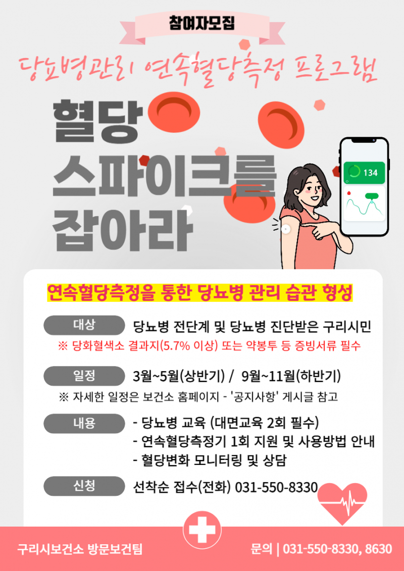 구리시(시장 백경현) 보건소는 2월 23일부터 당뇨병관리 연속혈당측정 프로그램 「혈당 스파이크를 잡아라」의 참여자를 모집한다고 밝혔다.
