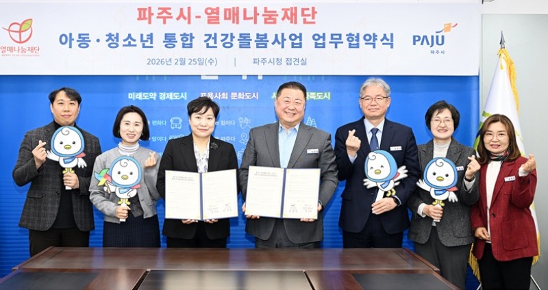 파주시는 25일 사회복지법인 열매나눔재단과 관내 취약계층 아동·청소년을 위한 통합 건강돌봄지원사업 업무 협약을 맺었다.