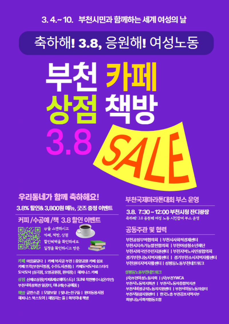 성평등노동부천네트워크는 3월 4일부터, ‘세계 여성의 날’을 기념하여 부천시 공정무역 카페, 동네 책방, 상점 등 20여 개소에서 ‘3.8 가격 할인’, ‘기념품 증정’ 등 다채로운 이벤트를 추진한다고 밝혔다.