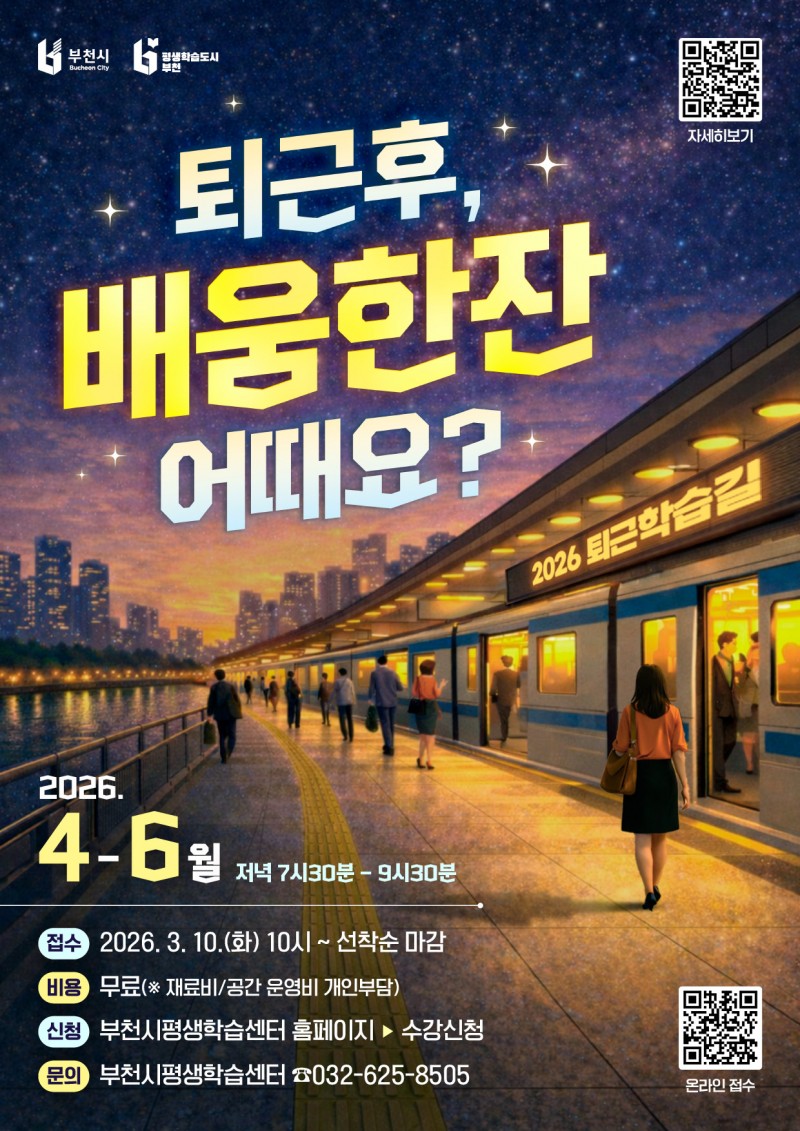부천시는 3월 10일부터 27일까지 평일 주간 시간 학습이 어려운 시민을 위한 ‘2026년 상반기 퇴근학습길 프로그램’의 학습자를 선착순 모집한다.
