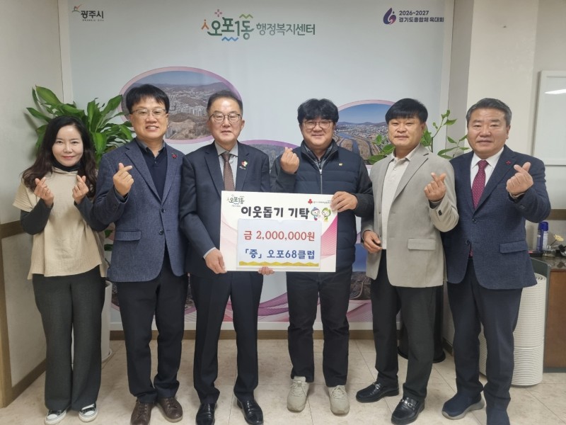 오포68클럽은 지역사랑 봉사 활동을 목적으로 오포 권역 내 1968년생을 주축으로 2004년 결성된 친목 단체다. 이번에 기탁된 성금은 오포 권역 4개 동(오포1·2동, 능평동, 신현동)의 취약계층을 지원하는 데 사용될 예정이다.