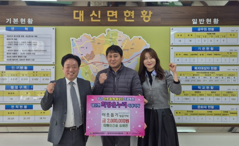 김태진 티에이건설 대표는 “대신면의 일원으로서 대신면과 주민들을 위해 앞으로도 변함없이 힘을 보태며, 지역사회를 위해 꾸준히 힘쓰겠습니다.”고 말했다.