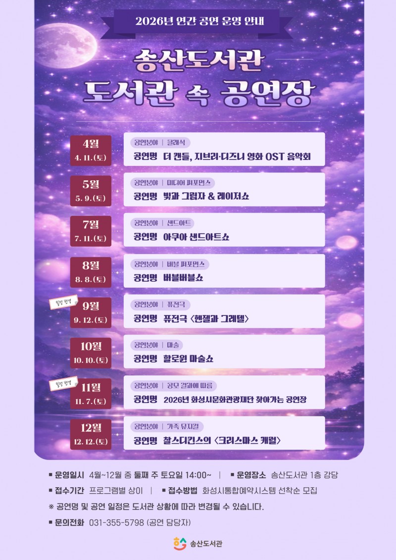 공연은 4월 11일(토) ‘더 캔들, 지브리·디즈니 영화 OST 음악회’를 시작으로 12월까지 매월 두 번째 토요일 오후 2시, 송산도서관 1층 강당에서 총 8회에 걸쳐 진행된다. 주요 공연 라인업은 다음과 같다.